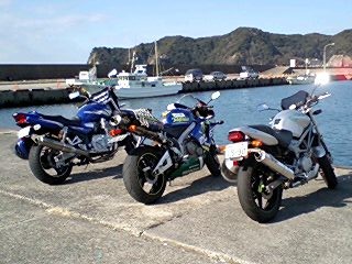 さて、2007年初ツーとなりました。集合時間はAM9:00集合場所まで2分くらい。目覚ましをAM7:00にセット。起床時刻AM6:00(--;)リビングでゴロゴロしながら朝食を済ませキッズの妨害に合いながら、少し早めに家を出た。ほどなく、今回の企画者であるAkira君のCBR600RR。そして友人のVTR君(名前は控えておきます)ユーロテイストに仕上がったVTR!カッコよろし(^^)そそくさと天津小湊へと向った。 ((((((゜W゜)))))) ガクガクガク・・・ 意外と寒いのですよ。そりゃ1月ですし・・・体よりも、アゴから進入してくる風がキツイ(><)いつものように誕生寺をお参りして海風に耐えられず、すぐに成田山に向けて出発! 小1時間走って休憩。 もはや寒くて先に進めない・・・日はまだ高いがポロっと出た冗談が結構本気モードの3人。 ( ̄へ ̄)成田山まで寒くて行ってらんねぇ と 体よりも心が折れてしまう・・・それならと、2人がお薦めのラーメン屋へ直行!!チャーシュー満開でスープも麺も見えないぞ!!!味もよろし!!!! 早速画像じゃ!! と・・ (;--)保存し損なってるじゃん・・・ ま、アレだ!興味が湧いたら、今度一緒に!という事で(^^;)で、ハンパな時間になってしまいVTR君は帰路に付いた (^^)また走ろうねそこからいつも時間を潰すコース南海へと向う。バイクを駐車スペースに置いて、メットを脱いで・・・ フォン!フォン!! (--)聴いた事有る音だな~ 珍しい05’モデルのXJR って (@0@;)アレ?俺??? 驚いた2人。というか、ちょっと呆れた事に・・・ 多分音からして、ウチのと同じノジマさん装備。Nプロのカウル・・・クリアウインカー・・・前を通っただけで確認できた外観の違いはフェンダーレスくらい (--;)凄く似てねぇ??ま、有りがちなカスタムかもしれないけど・・選んで付けてる部分がダブるって・・・あんまり無いか?!多分ノーマルフェンダー改のフェンダーレスだと思う (;--)ウインカー位置と良いナンバーの角度と良い もしや、ココのブログ見てる方?!?! (;`ё´)誰だ!! (; ̄- ̄)こりゃ少々路線を変えねばならんか? どういうふうに・・・ (;--)オールペン? (-3-)勘弁してよぅ