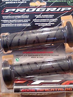 トイざらスにキッズを連れて行きました。予定していたソフトから 欲しいソフトが変更になり少々甘くしてしまい・・・2人の貯金が全部無くならないように・・・ (;--)俺も足して買った ちょっと痛かったけど仕方ないかぁ・・・ そのまま帰宅しても俺はツマラない。で、2りん館が営業してたら・・・という事で、3人で向った。それほど高価でもないし、ノーマルの扱い易さに疑問が生じてたので・・・グリップ購入!今年初のカスタムです(^^)めでたや!!ノーマルグリップは、ウインターグローブだと握り難いんですよね・・ツルっとしてて、掴むチカラが大きいんですよ。だから、もう少し握り応えの有る しっかりした物に変えたかったのです。プログリップは2重構造になっていて、振動を吸収するとか・・カラーもデザインも豊富で、黒/青か黒/灰のにするつもりでしたがシンプルな色合いが好きなので、結局 黒/黒のにしました。で、早速キッズがゲームに夢中なので俺は そのスキにガレージ(^^) バーエンドを外したら、ハンドルバーとグリップの間にマイナスドライバーを突っ込んで、CRCを流し込みます。そのままドライバーを 丁寧にバーに合わせて一周グルっと回してやればボンドが剥れて、外れてきます。ウエスでCRCを拭き取って、ハンドルバーにボンドを塗布。新しいグリップを差し込んで行けば完成です。スロットル側はスリーブに合わせて剥がし、同様に差し込みます。 で、完成!中間あたりのデザインされた部分がしっとり厚みが有って掴み易いです。多分クラッチを握るにも 少しばかりチカラ加減がラクになりそう派手ではないので、ソコだけが主張する事も無くそれでいてノーマルじゃない!ってのが大変よろしい(^^)スキ今年1発目は、まずまず満足ですな!!