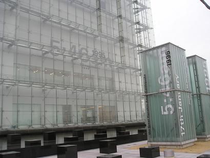 入ると、地震の起こった時刻で淡路から伊丹までの崩れていく建物の再現映画と、お姉さんとお父さんの会社を失った子供の追憶シーン映画が流れ、どうも感動にもっていこうとするちょっとムムムという洗礼を受けるが、当事者としては涙腺ウルルものになってしまうのがちょいと腹立たしく照れる。