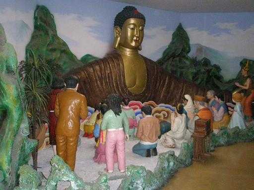 1階に入ると、仏陀が、どこかの山の頂にて説法している。仏陀が悟りを開き、初めて説法したときには、鹿もそれを聞いたというのだが、今や象も聞くのである。