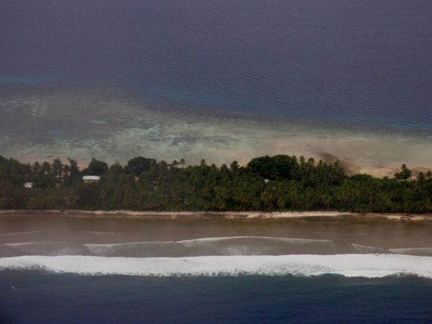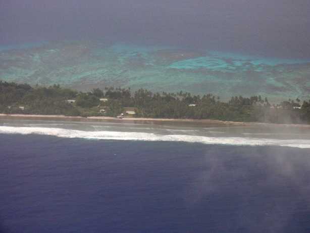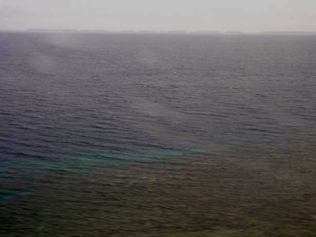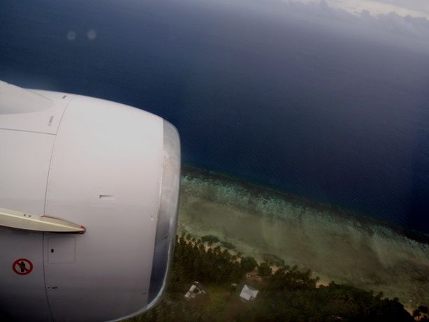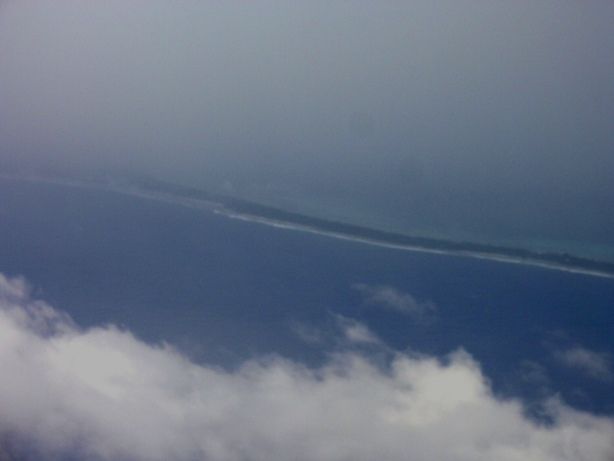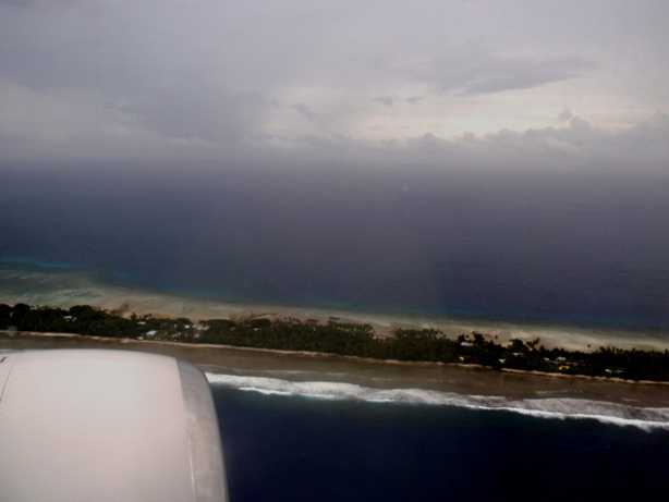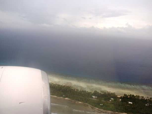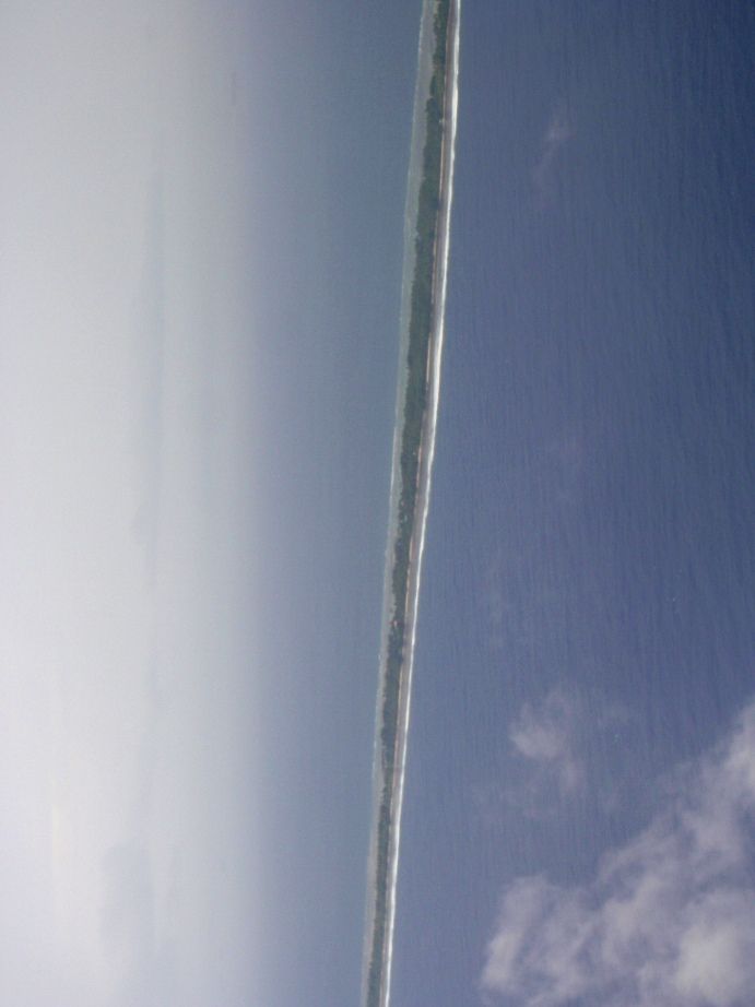 日本からグアムに行くのと同じくらいの時間、つまり3時間半程度で、マジュロに到着する。到着前に、海上をずっと飛んでいた飛行機も、ついに、ヒモ状の珊瑚礁が盛り上がってできた陸地が見えた。この細いのが国だと思うと、世界は愉快だと思う。