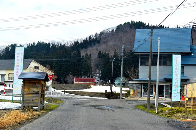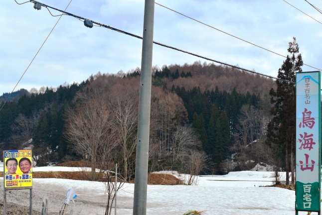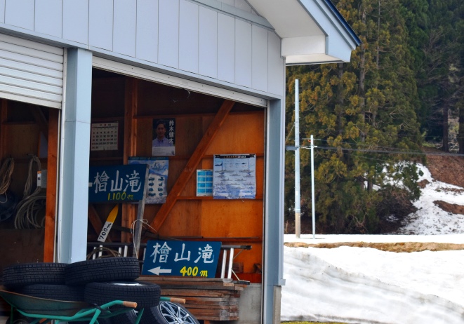 滝への入り口。やたら、秋田県、国民民主の看板だらけ。