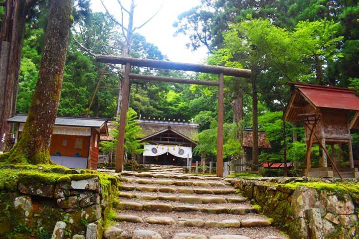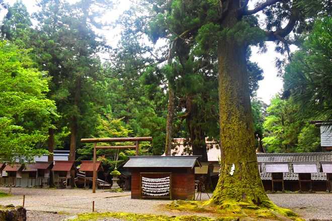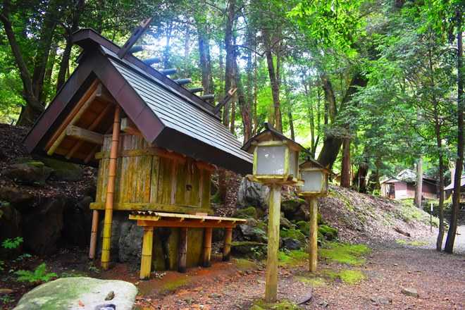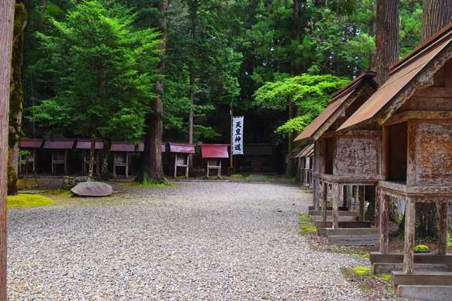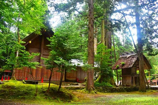 茅葺・神明造の本殿が厳かに鎮座し、それを囲むようにを80余社の小宮が並ぶ。