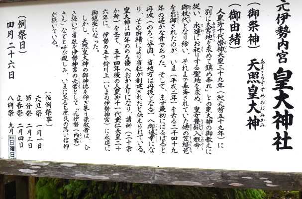 元伊勢内宮のHPから抜粋していくと、明治期まで、年間の参拝者8万人と記されており、麓には宿屋が10軒もあり、茶屋、土産物店が軒を並べていたという。当時でも川に舟が通っており、船着場から約4キロ歩くだけでr明治期まで、年間の参拝者8万人と記されており、麓には宿屋が10軒もあり、茶屋、土産物店が軒を並べていたという。当時でも川に舟が通っており、船着場から約4キロ歩くだけでラクチン参拝であったとのことだ。