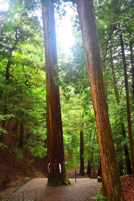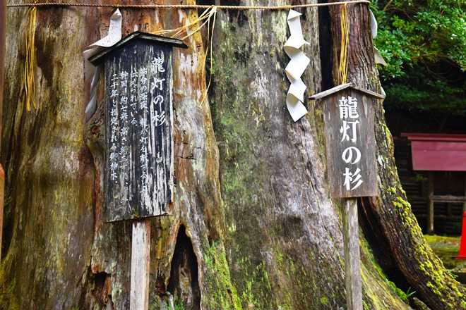 樹齢千年以上と伝える古木が参道に聳え立っている麻呂子杉 。元々3本あったという。