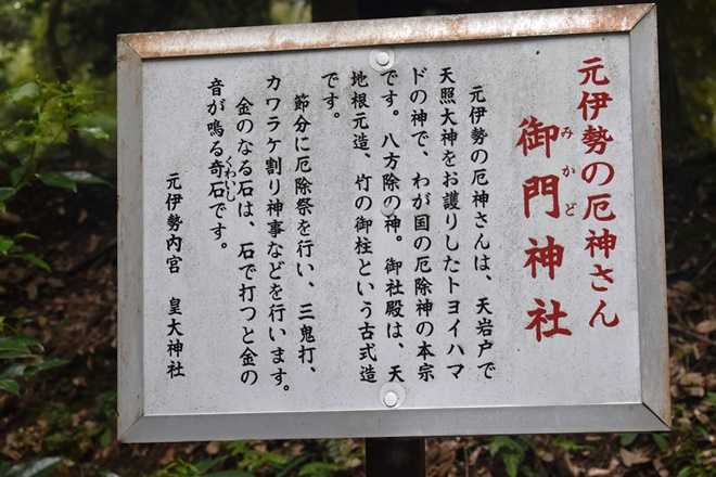 五十鈴川上の伊勢神宮に鎮座されるより54年前に大和地方(三輪山)から丹波舞鶴経由でこの地に天照大神のご神体を遷し、4年間祀った場所という。正面鳥居は、珍しい黒木の鳥居。樹皮のついた丸太のままの木で造る最も素朴で原初的な様式の鳥居。