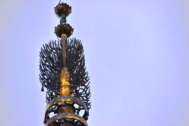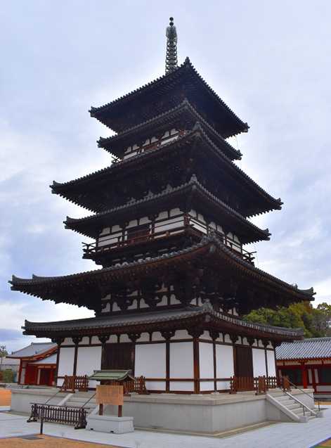 西塔。昭和56年1981年再建。再建に際しては、西岡棟梁により、鉄の使用を極力少なくし木材の乾燥収縮を考慮して東塔より約30センチ高くして再建されている。500年後には西塔も東塔と同じように材木の撓みと基礎の沈下が起きて同じ高さに落ち着く計算になっている。