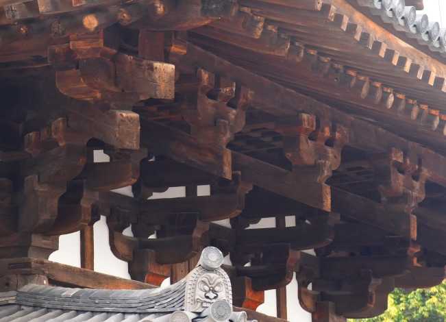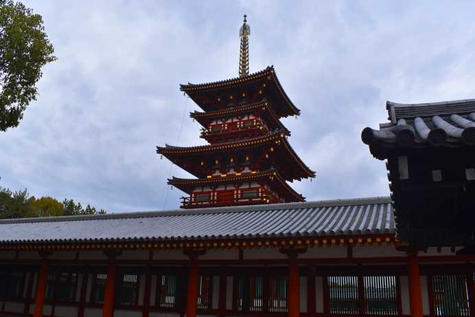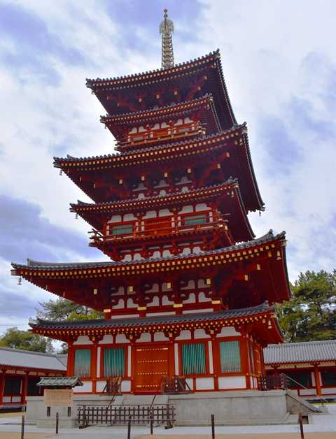東塔。白鳳時代(大化の改新から平城京遷都までの飛鳥時代に華咲いた文化。)、創建当時から残る唯一の建物、国宝。2009年(平成21年)の平成の修理。2020年(令和2年)末まで約110年振りの東塔の解体修理が行われた。その結果、創建当初の版築による基壇が良好に遺存していることが確認された。また礎石は明治時代に据え直された可能性があるものの、心礎、四天柱、側柱の礎石は当初位置から動いていないことも確認された。基壇の下から和同開珎4枚が出土した。