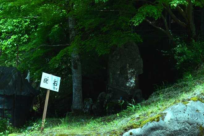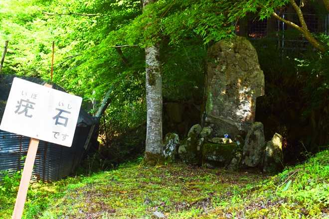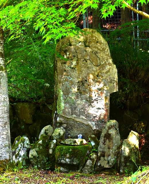疣石の石碑は高さ210センチ、幅80~100センチ、石碑の前に自然石があり、中央に窪みのある石。