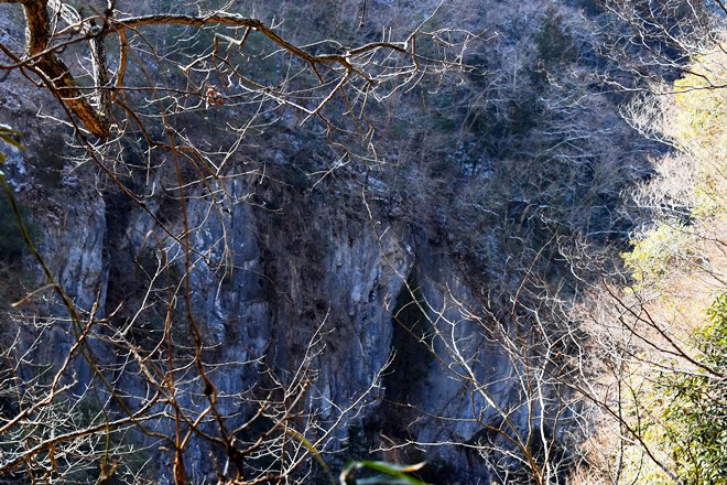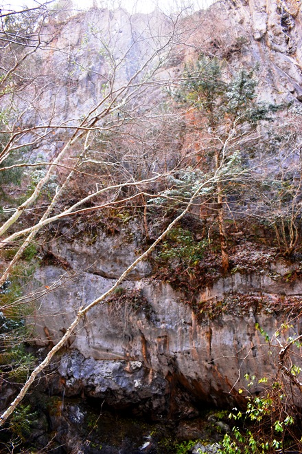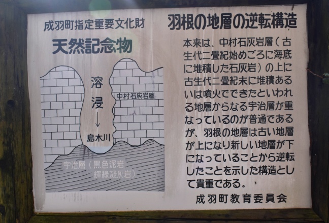 渓谷付近は「デッケン(押しかぶせ)構造」という岩盤構造。断層面が水平に近い衝上断層によって、遠くから運ばれてきた岩体が重なっている地質構造。