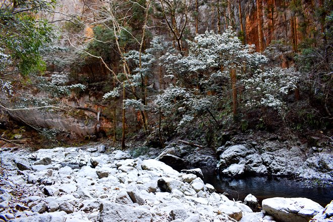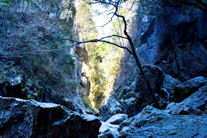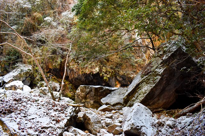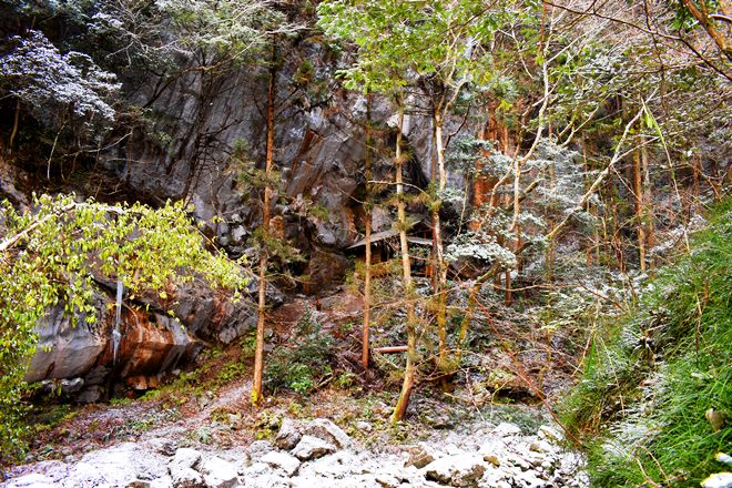 残念、ここで勇気ある撤退だ。大岩を抜けて、岩沿いに川を渡り、さらに側面を登ると滝だが、これは、滑ってしまう。落差25メートルの2段滝。
