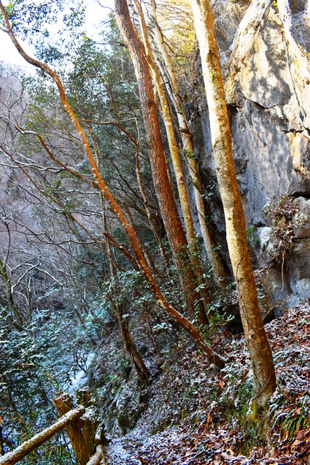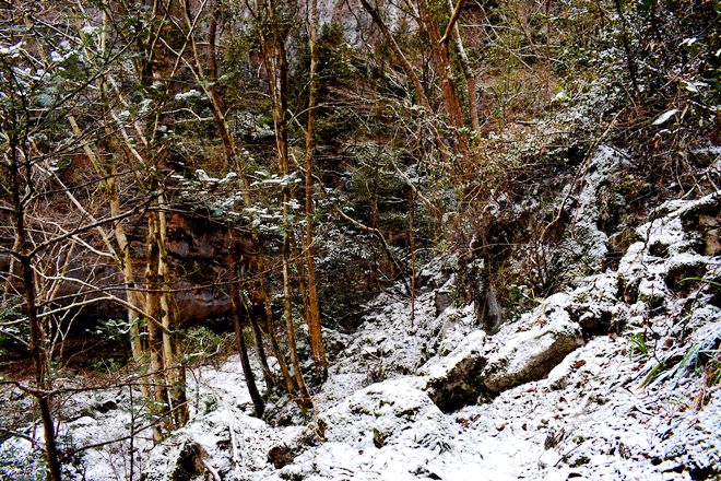いかん、大岩が阻み、雪と苔で滑るのでこれ以上進めない。
