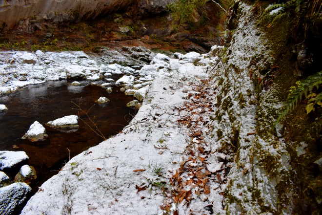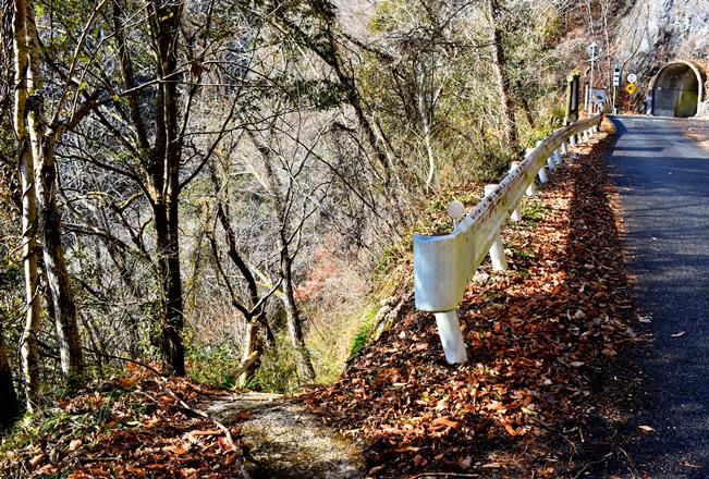 え、こんな細いところ行けるか、滑ったら川にまっしぐら、しかし、まだ行ける。ちょぼちょぼ歩きで進め。