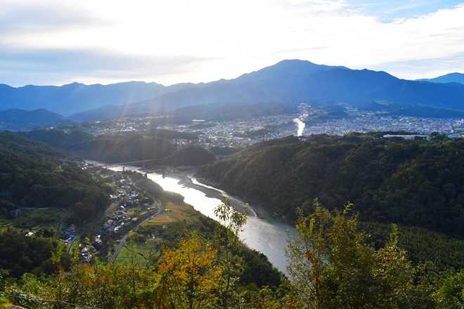 木曽川右岸、頂上標高432メートルから。木曽川から170メートル標高差。