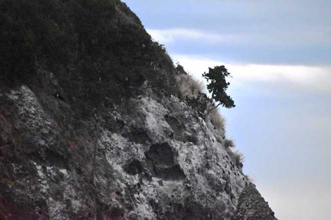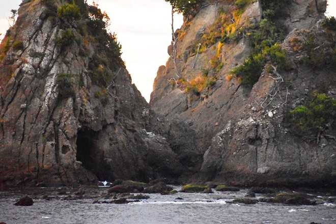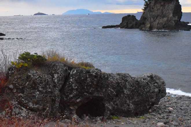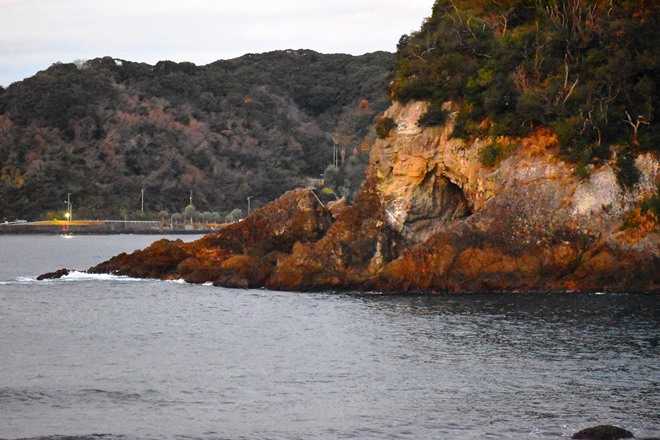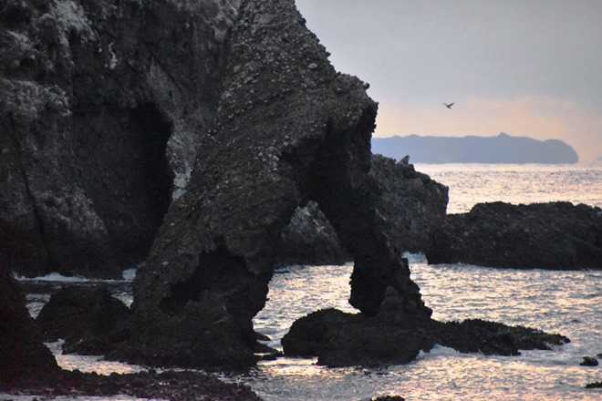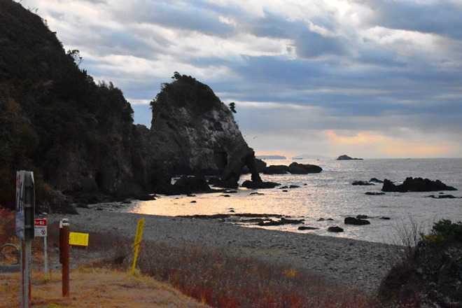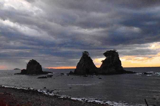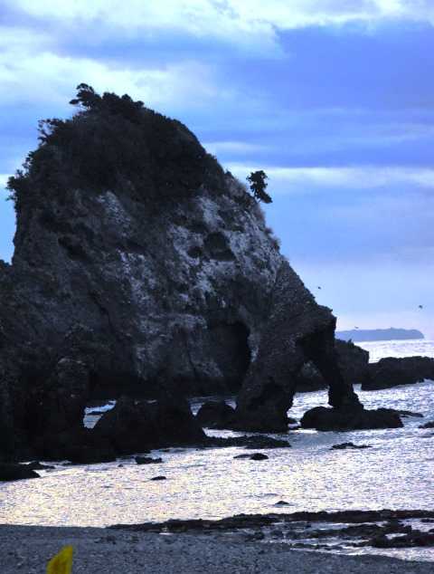 6時。2つの岩が雀岩。1つの岩が姑岩。干潮時はトンボロ現象でつながる。