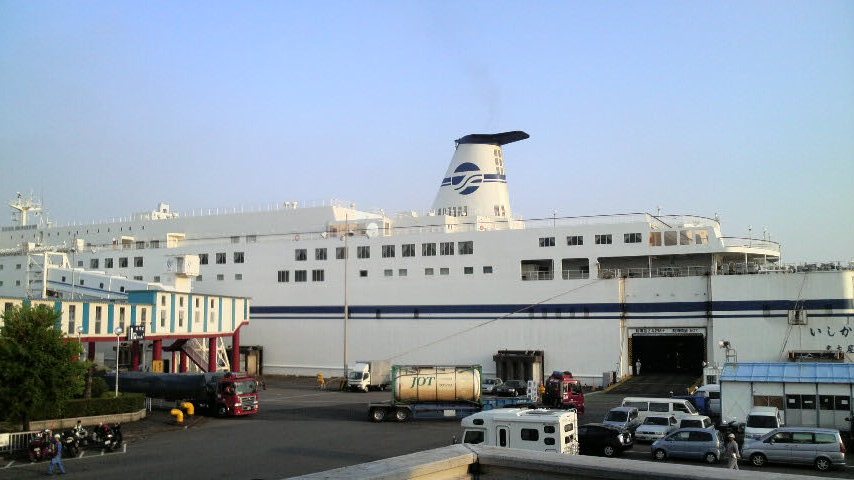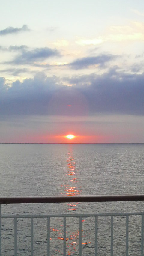 10月13日 今日は、きたかみ最終日 起きてお風呂に入ったらデッキに出て朝日拝みます(^^ もう、朝日と夕日はすっかり習慣(笑 朝日とか夕日とか船とすれ違うとか・・・ そんな事が一大イベントに思えてくるからフェリーの中は不思議です(笑 編集していて気が付いたんだけど・・・ 朝日と夕日はビジュアルが一緒www 説明がないとどっちだか解らないね(汗 ほらね?昨日の夕日とまったく一緒www 朝日を見たらお風呂に入って身体を温めて朝食です またまた、ポテトサラダをテンコ盛りで食べました 朝食を食べていると左手に神島が見えてきました(^^ ココから伊勢湾、名古屋港はもうすぐです(^^ 途中、セントレアが見えてきました(^^ 飛行機の離発着も見えたんだけど・・・ 携帯じゃ無理www この画像が限界でした(汗 名港トリトン(伊勢湾岸自動車道)の下を通って 前回通った時は夜でとても綺麗だったけど 昼間は昼間で圧巻でした(^^ 10時30分 定刻通りに名古屋港へ入港です 乗下船の時はエントランスがめちゃめちゃ混むので 俺は、例によって喫煙所で空いてくるのを待ちます 今回の「きたかみ」前回の「いしかり」と2隻乗船しましたが どちらも素晴らしい船でしたが、あえて順位を付けるなら 俺は「いしかり」のが良かったです 「きたかみ」は全体に赤を基調としていて何となく落ち着かなかったのと やはり「いしかり」と比べると古い感じが有ります 手入れが行き届いていないとか汚いとか言う事ではなく 設備の老朽化みたいなものはどうしても有りました 特に気になったのは窓のガラスで 「いしかり」はガラス越しに写メを撮ってもあまり違和感が有りませんが 「きたかみ」はガラスの曇りのような物が気になりました (これは掃除の問題か??) 展望風呂は「きたかみ」の方が窓が大きくて浴槽に座っても海が見渡せますが 「いしかり」の方は高い位置にあるらしく座ると空しか見えません 両船に共通している事ですが 2階の案内所の前に船長さんのコスプレ用の衣装が有って自由に着用して記念撮影が出来ます(^^ スチュワーデスさんのレベルは高いです! 結構かわいい娘が居たりしました(^^ 太平洋フェリーの方針か何かと思うくらいかわいい娘が多かったです 閑話休題 空いて来たので名古屋上陸です!! この後、同室6人で記念撮影をして二組の老夫婦は車で帰路に付きました 俺は、迎えに来たOさんとフランス人のおにぃちゃんと名古屋まで出て フランス人のおにぃちゃんは夜行バスで別府へ 俺は、Oさん宅へとそれぞれ別れて行くのでした 太平洋フェリーの航海ルート