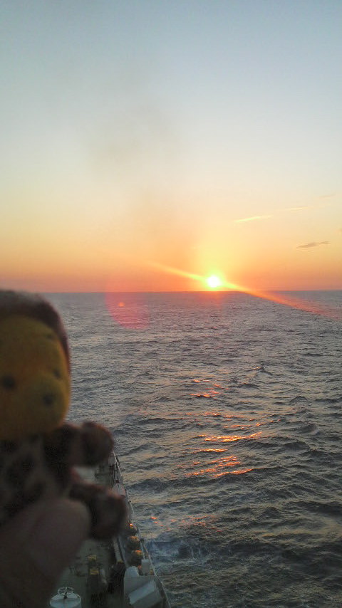 10月11日 約三週間ぶりに戻ってきました! 苫小牧フェリーターミナル 早速、搭乗券を発券して貰ってソファーで一休み 今回も朝食2食付で11200円のパックを頼みました そして、例によって二等船室 赤い所が俺の席 マットレスだけだと薄くて痛いんでシュラフを上に敷いてみました 寝心地が格段に違ったから今度フェリー乗る時もシュラフ持って来よう(^^ 18時 乗船時間になったので早速乗船 船内を一回り探検してデッキへ出てみました デッキから見た苫小牧港 夜の港は綺麗(^^ 隣には、三井商船フェリーのさんふらわあがいたよ(^^ 今日は、ふらのかな?? さんふあわあは苫小牧ー大洗を結んでいるので 夕方便だから明日の朝には大洗に居るのかな?? 一足先に出港して行ったよ(^^ こちらも出港したのでお弁当に頂いたおにぎりで晩御飯(^^ 今前での旅を思い出し自分の立場を思い出してちょっとセンチになる おにぎりがしょっぱかったのは塩のせいだもん・・・(T T さ、寂しくなんか無いやい! 今回はプーさんが一緒だもん!! 部屋に戻ってみると今日は空いているようで 年配のご夫婦がお二人とフランス人のおにぃちゃんだけみたい 仙台からの乗客も少なく20人以上寝れる部屋なのに二日間とも同室は6人だけだった(^^ 仲良くなって記念撮影したり夜な夜なバーで飲んだりしてたよ(^^ そう言えば、いしかりの中でもトラックの運ちゃんと仲良くなって夜な夜な飲んでたっけ(笑 昼間は、隣の席の子供と遊んでたの思い出したよ(^^ 10月12日 今回もフェリーの中ではめちゃめちゃ早起き(^^ 早速、朝日を見に行ってみました 途中の窓から見たらグラディエーションが凄い綺麗\(^^)/ デッキに出てしばらくしたら朝日が顔を出しました 相変わらず、朝のデッキは寒い(ガクガクブルブル 朝日に満足したのでお風呂で冷えた身体を温めます その後、9時ギリギリに朝食 例によってバイキング 例によってポテトサラダ死ぬほど食いました(^^ 10時 仙台寄港 フェリーターミナルからジャスコが見えて近いようで意外と遠い 今回は、暇だし買い物に行ってみたよ 近くにコンビニや電気屋なんかもあって便利そう まぁ、フェリーにでも乗らなきゃ用は無いんだけどね(^^; 12時50分 定刻通りに出港 14時30分 姉妹船のいしかりとすれ違い(^^ 三週間前にはアレに乗ってたんだよナァ~ その後、風呂に入ったり映画を見たりしていたら あっという間に日没の時間 デッキで沈み夕日を眺めて お風呂に入って冷えた身体を温めて マンマ・ミーヤ!を見終って部屋に帰ろうとしたらバーで捕まって また、飲んでましたwww こういて、きたかみ二日目の夜は更けていくのでした・・・