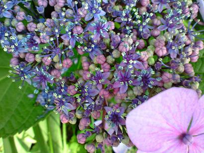 今日は梅雨入り?あじさいは雨も晴れも似合う花 【大きな4個の花弁でできているように見えますが,実は花弁にみえるものは「がく」なのです。本当の花は,その中心部に小さくついています】お花がガクで真ん中の小さいのが花なの~!!ぇえ~↑まだ花が咲いてないってこと(??)ま、満開ってことで。