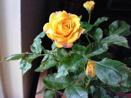 今年の1月10日にホームセンターで購入。と、いうか引き取ってきました。このホムセンが閉店になり薔薇の大売出し。上代\2000も\300セールに出遅れて残っているバラは10本位しかありませんでした。黄色とオレンジで綺麗だな~。確か去年の秋に\1280で入荷。ゴツイ株に細い枝が2本。タグは雨でクタっていて・・・ん~決めた。植え替えをしたら、根っこの方が立派。今・・・タグをよく見たら《フロリバンダローズ:プティート》OH!名無しのキイロちゃんだと思っていたらプティートというのね名前が判明。良かった。違ってもイイや。小さい花が可愛く咲きました。シュートが2本伸びて枝が4本。新芽が二つ。シュートが出るのが楽しみです。
