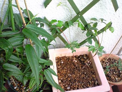 購入してから約三ヶ月でここまで育ちました。100均で見つけた緑の、のびーる何ていうのか?イイ感じ。右のマクロペタラ強風で葉っぱがクルクルして下葉がとれて、先の伸びていく枝も折れましたしばらくすると新芽が出てきました。強いのね~♪左のホワイトエンジェル葉っぱが笹みたいなのね~。冬咲く白いベル状の花が楽しみ。 真ん中のテキセンシス アルバニー(2年苗)ぜんぜーん咲かず、うどん粉病がひどくなってしまってので剪定してしまいました。これがイイのか悪いのか?ですが元気な新芽がいっぱい出てきたので自己満足。花後に植え替えとな。花が早く見たいのですが・・・えい!鉢替えしよう!ぁぁあ~葉っぱが取れてた。びっくり!!ごめんクレマチスは移動しない方がイイってこういうこと~。また葉っぱ出でくるよね~暗示かわいい葉っぱなので押し花にしよ。作品はいつになることやら
