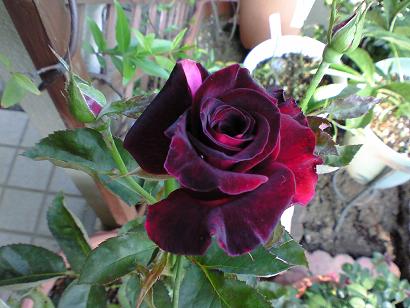 セントラルローズさんで人気品種なのでいつも売り切れ。待ちに待って今年2月にやってきたグラウンブルーです。3本のうち2本は蕾がつかなそうなのでピンチして新芽が出てきました。残りの1本に咲いた一輪♪すってきぃ~グラウンブルートマト屋さんのブルームーン