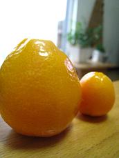 農村の金柑が大きくなっとります。右が普通サイズかと。ジャムにしてみよう~と作ってみたら甘露煮風な感じです。砂糖は大佐が作っているビート、てんさい糖を使いました。おなかにやさしいのよ。 青い森から最後の1個。ジャムにしょうと煮詰めて~コンポートみたいだな。金柑も入れてみよう。うましジャムの瓶かわいいね。チェックの小さいのはオマケ。 まだ生っていた柚子を取りました。イイ香りです。昨年作ったゆずジャムは、美味しかったです。頂いた柿を食べてみたら、美味しかったので、柿好きの兄に↑あれ食べられるの?「家の柿はうまいよ。売ってるのと比べ物にならない」・・・そう・・・なんだ。兄に取ってもらって、剥いてもらった。ははは(^^;)甘い~。親父が柿を見て、「これは家の柿だろ。旨いけど完全に渋が抜けない」トンボレシピで柿ジャムを作ろうと5個取りました。母親がそれは、まだ渋いんじゃないの?え・・・そうなの・・・。剥いてみると、綺麗なオレンジ。ダメだこりゃ・・・。鳥さんどうぞ~って渋いの食べないか(^^;)寒くなると、椎茸が“どんこ”っぽい。お日さまに当てると旨み、栄養もするぢょ。↓1週間後カチカチ 母親が切干大根は細い方もっていきな~って。水に戻したら、これは~お刺身の“つま”ですか!?煮物は作りすぎたけど、美味しくて写真撮る前に完食です。