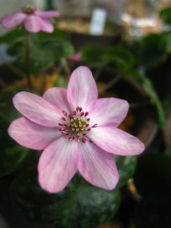 昨日は気温上昇暖かくなるから、おじぎしてなかなか咲かない雪割草に会えるそうなのに残念ながら午前中から仕事ですそれが~休憩時間を長く頂けてにダッシュうれしぃ~の雪、昨年よりも大きく咲きました。葉っぱも元気。でも、青軸ではありませんでした。アハハ~^_^ほんのりピンクちゃんカワイイ ○オクの雪ちゃんラベルに大先生のお名前が!花粉をつけていただいたとか?妄想講演会でお隣だったおばさまも大先生と知り合いで花粉をつけていただいたそうです。大先生からの雪ちゃんの輪ドリ家の雪ちゃんの中で、一際輝いて見える銘品は博士っこです。先端部に紅をさしたように赤が出ていていろっぽ~い舞妓は~ん開花しました。うわぁ、博士のブログで拝見した“つま紅”みたい赤いしべもきれい。つま紅でした posted by (C)ドリ天神梅は白に桃覆輪の標準花品種。ケスハマソウの一種で、梅弁の大輪種(園芸ネットさんから引用)梅弁じゃないので、どうやら“つま紅”のようです。ようこそ、つま紅ちゃん一番のお気に入りっこです梅まつり(展示会にて)
