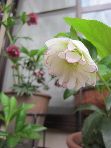 師匠宅のクリスマスローズかわいいピコティーが咲いています。sale クリスマスローズ【現品】クリスマスローズ 開花株 ピコティ系ダブル咲き 41708 千草園芸さんとても良心的なお店割引券はうれしい グリーンだけど、白のピコが脱色 フクイフラワーショップでグリーンのピコティを買ったそうお店の対応良かったそうです。小さなかわいいクリスマスローズチューリップがおじぎしてるみたい 農村のシングルが一輪だけ咲いていました 白いダブル横向きに咲いたりおじぎしたり清楚なクリスマスローズです。