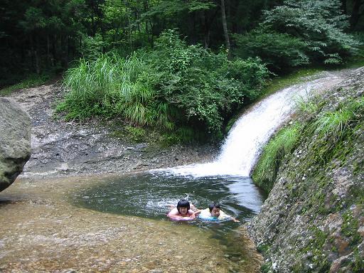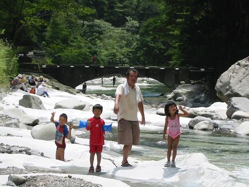 面河渓はとても涼しかったので、川に入らなくてもすごせそうだったのですが、川を見つけるやいなや、早速水着に着替えて水中眼鏡もつけて、一日中川遊びを楽しんでいました。五色河原では、3人の子ども達がお互いに助け合いながら、川の流れや岩の大きさなどを自分たちで確認しながら、川くだりと川登を何度もやって、冒険心とスリルを味わっていました。必死で遊んでいる子ども達の眼はやっぱり生き生き輝いていました。