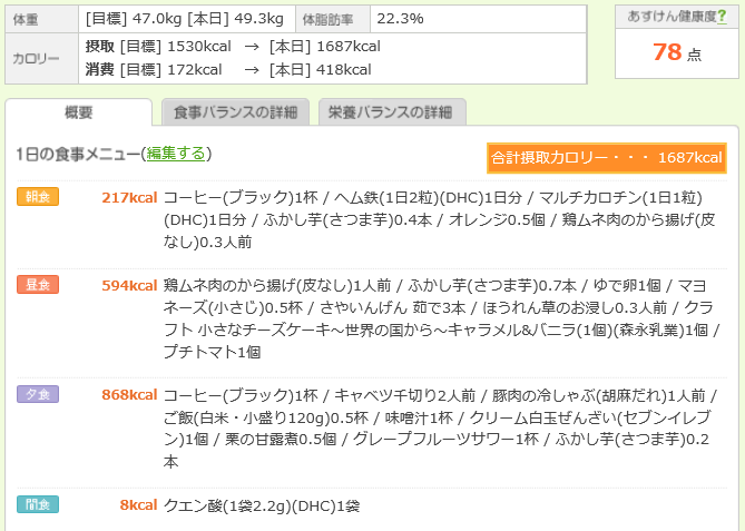 怒涛の補完入力中。ブログのつじつま合わせ中(^^;)9/17(土)体重:50.8kg体脂肪率:24.4%総消費カロリー:2092kcal総摂取カロリー:2135kcalカロリー収支積算:603kcal(※あすけん開始、5/27から自己流カロリー収支補正後の値)記録が滞りがち(°_°)ブログは放置(°_°)こんな時はろくなことをしていない。やばいなー。去年、この9月の連休中から体重が増えてアベレッジが49kg台から50kg超へ移行しちゃったんだよな。またマクドに行った。ふなっしーが欲しかった(笑)すごく久しぶりに「ハッピーセット」を頼んだけど、野菜生活を頼めば紙パックで貰えた覚えがあったのにカップで出てきた(°_°)持ち帰るつもりが飲む羽目に。半分捨てた( ;´Д`)芋が美味い。夏から食べ続けた芋の甘みが増しているかな?日曜の朝の分まで食べてしまったよ( ;´Д`)【毎日の食事記録はあすけんにユーザー名TTRで記録中】なんちゃって糖質制限でなんとか50kgまで減量できたのですが、あと3キロがどうにもならない( ;´Д`)60kg級超丈夫な胃袋にさいなまれ七転八倒しながら47kgを目指していますm(_ _)mランキングに参加していますm(_ _)mにほんブログ村「カロリー収支をマイナスに」を毎日の目標にしています。消費カロリーはこちらで管理。摂取カロリーはあすけんで管理しています。EPSONさんとあすけん…提携してくれないかなあ。同期できたら楽なんだけどな。PS-600B【税込】 エプソン ウェアラブル脈拍計(エナジャイズドブラック) EPSON PULSENSE 液晶表示タイプ [PS600B]【返品種別A】【送料無料】【RCP】2014年の夏、この本に出会わなければ一生60kgBMI25だったに違いない。炭水化物が人類を滅ぼす [ 夏井睦 ]2014年最大62kg2014年7月糖質制限開始58kg最低体重記録 2015/1/31 48.05kg2014/12/31 49.05kg2015/12/31 52.40kg2016/2/21私流ナンチャッテ糖質制限ダイエット日々修正しすぎて最近はカロリー収支を重視しています。糖質制限緩めまくりです。
