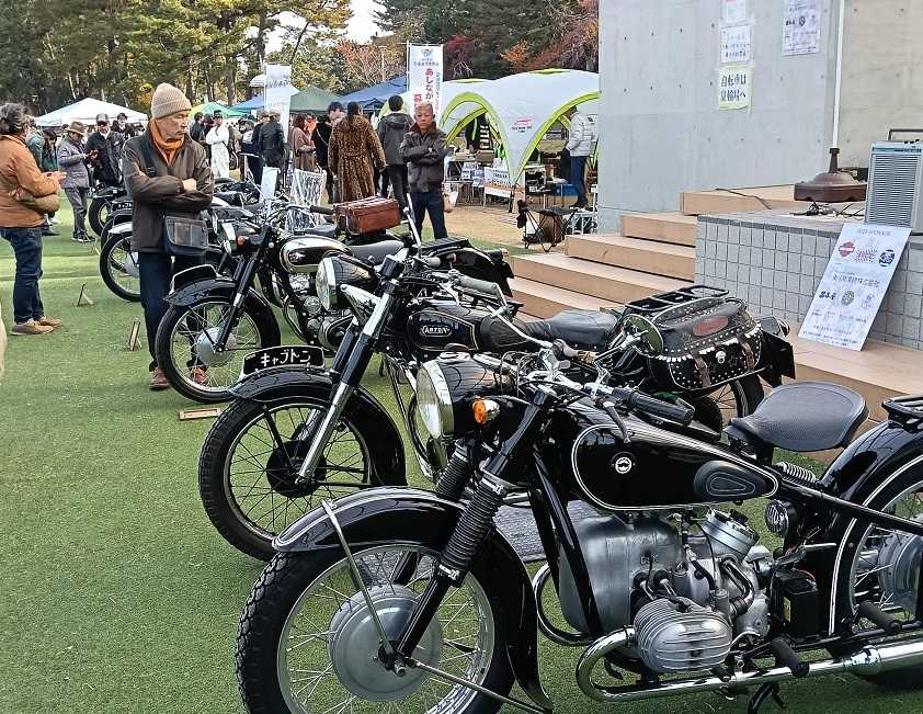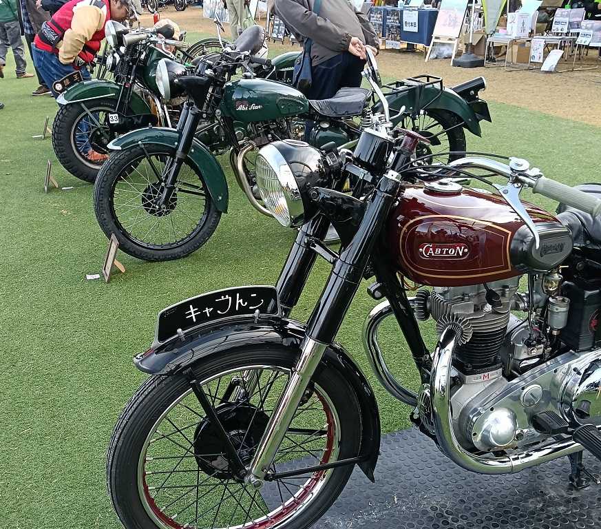 同じ1951年のラビット、エンジンは中に入ってるので地味。ボディはジュラルミンなので隼かゼロ戦の残り物。積車から会場まで遠い、エンジンかけれないので押して行く、普通はニュートラルにすれば軽く押せるがラビット5インチは押しがけ専門(通称オス)デコンプ引いてもクランク回るので重い、これで疲れた。