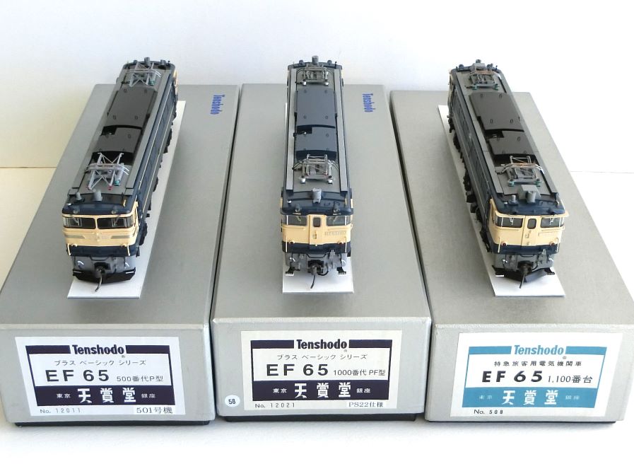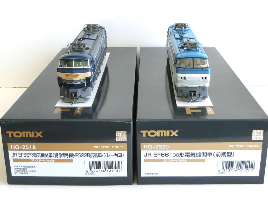TOMIXの左からEF66特急牽引機グレー台車PS、EF66-100前期型PS。