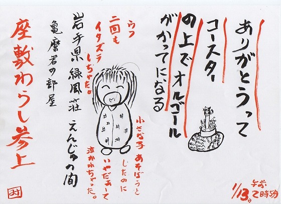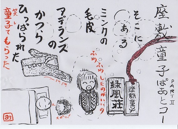 座敷わらしの興奮冷めやらぬうちにPART2一緒に同行した げんきshop店長。亀麿君を見てしまったのだが、自分でも、夢か現実か、自信がないとのこと。夢にしては、私が、体験してしまった時間帯と隣に寝ていたマダムがかつらを取られそうだって、ねぼけまなこで押さえてた時間帯が、一緒夢か、幻か、亀麿君はかなりのイタズラ好き。それを、見てしまった。元気shop店長のショックは想像できる(^^)‘‘‘! 受けたら、ぽっちっと、ひとつ。おねがいします。 ↑↑↑ みさちゃんに応援クリックを