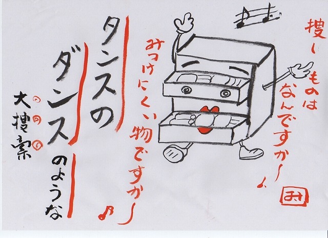 え~と、どこにしまったけ・・・。ここでもない。そっちでもないし??上のひきだし?下の引き出し?どこお~?まるでたんすのダンス・・・。いっしょに踊る。いっしょに歌う。今年も笑える楽しい暮らし!! ↑↑↑ みさちゃんに応援クリックを