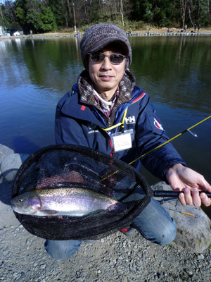 皆さん こんばんは。またまたご無沙汰してました(^^;)(汗)実は前回ブログアップした翌日の朝に母が具合悪くなりまして・・・店閉めてかみさんと3人で病院に・・・私は二人を病院に送った後、帰宅して仕事に・・・これが忙しくて・・・数時間後、神さんより連絡入り・・・様子が分からないので検査入院とのこと。その日から数日間、何が起きたか毎日忙しくて・・・超くたくたで(_ _;)激疲。かみさんも病院行ったりきたりと仕事で大忙し・・・ご苦労様です。そんなでしたが土曜日に退院許可が出て、私の姉と息子が迎えに行ってきてくれました。結構元気で安心しました(原因はまだはっきりせず、来月また検査するそうです)とりあえずそんなで状況でしたので自分の具合の悪いのも吹っ飛んでしまいました(大汗)そして12日(月)はゼニスの友人と管理釣り場の東山湖にいく予定でしたが前日に大会があり、連休とも重なってかなりのプレッシャーと帰り道が激混みになるかということで中止にしました。実はゼニスの今年の新製品のトラウトロッド「エリアシャフト」の完成品が届いたのでそれを使う目的でした。月曜に行けないのなら火曜に行こうかなと思っていたところ、娘が火曜はお休みなんだということを知り、何気に誘ったら・・・少しなら行きたいな~と・・・(^-^*)マジ?じゃあ近いところに行こう♪ということで火曜日に川崎にある管理釣り場「ベリーパーク 王禅寺」に行ってきました。朝、娘の家に迎えに行き・・・釣り場にGO~現地には11時半過ぎに到着!晴れてて風もなく暖かくてまさに釣り日和!ついてるな~とりあえず準備してやりたい場所が空いていたのでポイント確保して・・・プチランチ(^^*)3時間チケット買って、11:58より釣り開始!久しぶりの娘に釣り方を教えて・・・本人、しっかり覚えていて大丈夫でした(^-^*)!私はニューロッドの調子を確認しようとスプーンから始めます。流石に一通り叩かれた後なので渋かったですがパターンをつかんだらポツポツ釣れるようになり・・・数匹目にちょっといいサイズが釣れて、ニューロッドと一緒に娘に撮影してもらいました。その後、娘にも良型がヒットして・・・今度は私が撮影を・・・(^-^*)♪その後も私はコンスタントに釣れて・・・娘はずっとは疲れちゃうようでちょっと釣っては休憩の連続。それでも十分楽しんでくれて・・・連れてきて良かったです(^-^*)♪なんだかんだで気が付けばあっという間に3時間が経って終了~釣果は、私が35匹,娘が14匹とまあ久しぶりに釣りしたにしてはいい釣果かなと(^^;)ひょんなことで娘と一緒に釣りができて楽しい休みになりました♪また休みが合ったら一緒に行きたいと思います。それでは