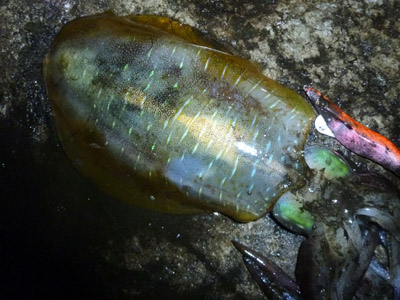 皆さん おはようございます。今週もしゃくってきました!(爆) ちょっと疲れているので簡単に報告します。 日曜仕事後に出発・・・現地に到着、即開始・・・即コウイカゲット(650g)・・・30分で終了・・・仮眠。 寝坊しちゃって3時起床・・・30分後に開始・・・即アオリゲット!・・・その後も順調に釣れて・・・明るくなってもしばらく釣れて・・・3時間ほどやり終了。なんと2130,1250,1210,1100,900,820,640gの計7杯ゲット (^▽^)bまたまた2キロアップが釣れちゃいました(嬉しい) その後、他の気になるポイントを見て回り・・・昼前に仮眠(3時間半)・・・起床後、さらに他のところを偵察・・・向かい風爆風で無理なので移動・・・他に数か所偵察し朝のポイントに移動。夕マヅメより開始・・・しばらくして超大型が乗るもかなり走られた後エギを離されて(>О<)激泣き、横抱きだったみたい。 その後、850gを釣るもショックからまだ立ち直れず(情けない)・・・それからしばらくしてYAGIさん、T君登場(爆)・・・私、仮眠(1時間)・・・その後は朝まで通しでがんばり、バラシ1、すっぽ抜け2と下手さ全開(恥)・・・結局、1280g追加しただけで終了(AM6時)YAGIさんとT君はここで終了(お疲れ様でした) 移動し朝食済ませてからまた気になるポイントに・・・なんとここ、やっと釣れだしたようで(^^*)目の前でヤエンで3キロアップ釣るの見ちゃって(凄デカ!)・・・急遽、エギング開始(爆)お隣さん、2杯釣るも私はダメ・・・2時間ほどやるも睡魔に襲われ一時終了・・・仮眠(4時間)最終戦は朝の場所かここの場所か悩んだけど・・・どうしてもここの場所が気になって勝負!やりたいポイントは先行者がいたので慣れたポイントで開始・・・周りでぽつぽつ釣れるも私のエリアは全く(辛い)・・・やっと乗ったと思ったら紋甲イカ(1110g)、つづいてチビ赤いか(ーー;)なんでアオリじゃないの? 完全にポイントを外してるみたいで・・・そして予定時間になったので終了に・・・悔しいな~とこんな感じでした。 今回もいろいろな状況も見れて勉強になったり、いろんな方とお話をしたりと楽しい釣行になりました♪二日目は痛い思いしたけど初日に楽しませてもらったからプラスマイナスゼロですかね(^^;)次回はどこでやろうかな~?春のホームも気になってるのでそこで勝負かな?(未定ですが)それではまた~(^^)/