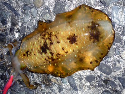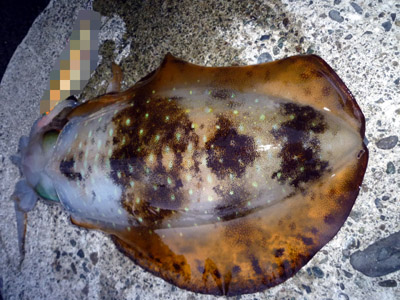 つづきです。16日(火)朝2:45起床・・・ちょっと疲れてますが今日はなんとか釣らないととしっかり準備してポイントに・・・到着すると一番乗り~!まだ早いよね(^^;)・・・早速釣り開始!しばらくするとエギンガーが続々と・・・やっぱ明け方がいいのかな~そして昨晩話したエギンガーさんも来て・・・気合でしゃくります・・・しかし誰のロッドも曲がりません・・・よくある前日はよかった~じゃないだろうね(不安)そして時間だけが過ぎて・・・ここで釣りしている方は皆仲間だということを知り(^-^*)・・・皆さんに仲良くしてもらい・・・楽しく釣りができました(釣れませんでしたが・・・(汗))で私は朝の地合がすぎてこのままだとほんとやばいと思い移動を決意・・・皆さん、秋にあそこのエリアでお会いしましょう!楽しい時間をありがとう(^-^*)/そして最初の目的地の南に向かって・・・すると雨がポツポツと・・・なんで~(><)もういいや~と・・・お腹がすいたのですき家に・・・がっつり食べました(^-^*)♪エネルギー補給完了!(爆)その後、数箇所見て周り・・・疲れてまた仮眠(_ _)zzz(どれだけ寝てんだよ!)そしてこうなったらダメ元であそこで勝負しよう!現地に着くと潮は穏やか・・・風も微風で・・・天候も悪くなく・・・先行者はヤエン1人だけ。釣れてる様子はない・・・そうだよね~、前日朝にやったときも雰囲気よかったのにダメだったもんな~今回もダメなのかな~、でもやってみないと判らないのでとりあえずここで勝負しよう!準備をしてどこでやろう?最近はあそこやってないから久しぶりにやってみよう!開始後しばらくすると後ろから声が・・・あら久しぶり~(^-^*)墨仁さんでした♪しばらく情報交換して・・・なるほど、そうなんだ~・・・彼も頑張っていてしっかり2杯釣ってました、流石!その話を聞いて私もこのままでは終れないな~と落ち込んでいた気持ちに再度活を入れて・・・並んで一緒にやりましょう!・・・彼のロッド裁きはなかなかですばらしい(私にはまねできませんが(汗))しばし勉強させてもらって・・・しかし釣れないね~とぼやきながら話の話題がパタパタに・・・お互い苦手にしているようで・・・ああでもないこうでもないと・・・やっぱり男はガンガンシャクリでしょうと(^^;)(爆)単なる負け惜しみです(恥)でも使わないで偉そうな事は言えないからなんとか1杯でも釣りたいとがんばって使ってみます。するとだべりながらやっているときに引っ張られるアタリのような感じがして・・・ジジジジジ・ジーーーーーキターーーーーー(^∇^)!ドラグがゆるいせいかガンガンラインが出てかなり大きいの?でも途中ドラグを少し締めてやり取りして・・・まあまあサイズかな?浮いてきて良型確認。ギャフアップして・・・やった~やっと釣れた~♪ この時期のイカで長さはあるのに軽くて・・・1510g(墨仁さんに測ってもらいました)でイカが回ってきたということで二人でテンション上げ上げでしゃくります。そのうちにエギンガーが一人、また一人と増えていき、気が付いたら釣り場にはかなりのエギンガーが・・・中には某ブログの方やここの常連の強者などいい面子がいます。これで誰が釣れるかが楽しみで・・・私も更なる釣果を求めてしゃくります。でもここで最初のアクシデント・・・キャストに大事な右手人差し指の先端がやりすぎで切れちゃって・・・痛くてビシッとキャストできません(><)・・・とりあえずシリコンマスキングテープで補強してやりますがある程度やるとまた剥がれちゃうので困ったもんです(何度も張り替えました)そしてしばらくやってて釣れないね~とか言ってたときにまた私にラッキーにもアタリが・・・ビシッ!乗った~・・・そしてやり取りをしようとしたときにアクシデントが・・・悪い足場でバランスを崩したときに足を置いたところが滑ってそのまま海の中に・・・バシャ~ン!!!・・・落っこちちゃいました(^^;)大恥幸いにも太ももまでの落水でイカは乗ったまま・・・すぐに上陸しようかとも思いましたがとりあえずイカを釣ってからと(爆笑)・・・ウエーディング(?)しながらやり取りして墨仁さんにギャフ掛けしてもらってから上陸・・・ 880g釣れてうれしい~、でもめっちゃ恥ずかしい~(≧∀≦)赤面・・・皆に激笑されてるな~とでも皆さん、大丈夫ですかと心配してくれて・・・ありがとうございます、全然大丈夫ですと・・・(この時は)とんだパフォーマンスをしちゃって・・・でも場が盛り上がってよかったのかな?(爆)とにかくいい時間帯なのでもたもた出来ないと・・・私も着替えは持っていましたがこのまま着替えずに釣り続行~(超爆)いい笑い者です(^^;)で辺りも真っ暗になり誰も釣れなくて一人、また一人と撤収していく中、しゃくったときにズシンと・・・なんか乗った~、でも引かない・・・でも重い、もしかしてモンゴウイカ?・・・グリグリ巻いてきて・・・足元でライトを照らすと・・・何だこれ?気持ち悪り~ 見たことのない小さなエイ