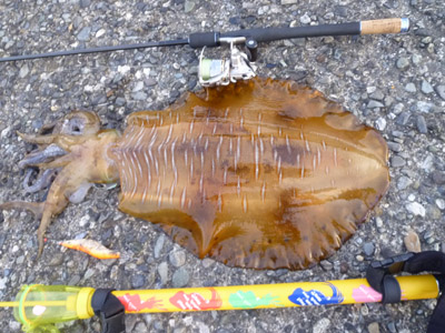 つづきです火曜朝3時半に小雨の中、釣開始!ヤエン師が一人だけいて話を聞くとアタリはあるけど釣れないと・・・とりあえずやりたいところは空いているのでそこで勝負・・・しかしやはり前日と同じで波バシャバシャ&流れ藻だらけ(><)・・・全くアタリもない・・・そして明るくなり・・・外した~(; ;)(泣)流石にねばる気も起きずに移動・・・ここにはヤエン師とエギの方が・・・聞くとともに1杯づつ釣っていると・・・あちゃ~ここがよかったんだ~(後悔)・・ならばやってみようと・・・開始すると10分もしないうちに風が爆風になり雨も強雨に・・・(><)皆退散・・・ほんとついてないね~((泣))・・・何かに祟られてるのかな~?どうしよう・・・とりあえず飯だな(^^;)笑その後、いろいろ考えて・・・あそこの磯まで行ってみよう途中、2箇所見ましたが風が凄くてダメそうでした・・・で目的地に到着!海を見るといい感じに!じゃあやってみましょうと・・・テクテク歩いてポイント到着!水色もよくベイトいて・・・今日はここで勝負しようかな、実績もあるし・・・とりあえず1時間ほど探って一旦切り上げて午後の上げからやろうと・・・その後は釣具店に行き、ショッピングセンターに行き、食事に行き・・・有効に時間を使って・・・午後3時に戻ってポイントに・・・誰もいなくてラッキー!これで後半は勝負できるぞ~釣開始して・・・1時間が経った頃から風向きが変わって・・・そしたらごみや流れ藻が・・・また?もう勘弁してよ~、今回の釣行は流れ藻との格闘ばかりです(_ _;)そして・・・30分ほどして波も荒くなり・・・もうここもダメだ・・・悔しいな~、ほんとついてないや・・・戻りながらやっていこうとそして車で走りながらどこをやろうかと思ったときにふとあそこが気になって(ある方のブログにあった「こっちにおいで~」って言う声が聞こえたような・・・おのやすさん?)でポイントに行ってみると例のポイントに神風が吹いていた!しかも沖にはくっきりとしたいい潮目も出ている・・・これはもしかしたらと・・・早速準備してポイントに・・・ここではまず今回のために初めて買ったデュエルのパタパタ君ラトル、使ったことないのでやってみることに、もしかしたら・・・でもいろいろな感じでやってみましたが私にはどう動いているのかが全く分からず(恥)さっぱりで私には合ってないな~と・・・ここでいつもの定番のエギに・・・そしてデカイカが釣れる時のあの誘い方で・・・これはある達人に教えてもらったやり方で今までにかなりいい思いをしているシャクリ・・・そして事は起きた!超ロングキャストのあとの1シャクリ目のあとのロングフォール・・・潮に任せてしばらく落としていく・・・微妙に引っ張られる感があっていい感じ・・・そして次の誘いを入れようとボトムからエギを浮かせようと軽く聞くと根掛かっている、こんな沖に根があったかな~?少し引っ張っても動かず、強めにぐいーって引っ張るとじわっと動いて、そしたらジ・ジ・ジ・ジ・ジ~~~~~~~~~~~~~~~~~~~キターーーーーーーーーーデカイカ乗った~~~凄い勢いでスプールが回って・・・・すげ~久しぶりにこの光景見た~!やった~それもいいけどスプールがとまらない、やばいラインがなくなるかも?どうしよう?前日に三太郎さんとデカイカ掛けたときに焦ってスプール止めようとするとばれるというのを思い出して・・・ここはとまるのを祈るしかない・・・そしてようやくとまった(- 。-;)でもかなり出されたな~、ラインの色を見ると約120mちかく出されている、しかもまだジリジリいってラインが出ているどうしよう?ここは耐えるか、それとも寄せに掛かるか・・・だいぶ弱ったと判断して寄せに掛かる昨日まで散々巨大流れ藻と格闘していたんでこの感じは慣れている(大爆)・・・それにしてもかなり行っちゃってるので何かと時間が掛かる・・・この時のどきどき感は半端ない、凄く長く感じましただいぶ寄せてきてそろそろ浮き上がる頃かなと沖を見るとエンペラーがベラベラしているのが見えた!かなりでかそうだ!・・・しかしよくある横抱きで手前に来たときに離されてバイバイというのもあるのでまだ信用できずに慎重に・・・そして近くに来た頃にいきなりのジェット噴射で突っ込まれて大焦り・・・やべ~ばれないで~そして何度か突っ込みをたえて足元に・・・やべ~でかいよコレ!・・・そしてギャフアップ!1発で決まった~!やった~~~!思わず叫んでしまった(^^;)恥ずかしい。イカをぶら下げて堤防に置いて・・・しばし呆然・・・いや~やっと釣れた、今回いろいろとやるも裏目に出てダメなことばかりで、でも諦めずにがんばって・・・なんか涙がでてきたような・・・ポロリ(; ;)でもやっと釣れたデカイカ、嬉しい~~~~~(^▽^*)♪あまりの出来事に秤を車に置き忘れて・・・取り合えず長さを測って・・・45.5cm重さはあとでということで袋に入れて再び釣り再開!・・・しかし気持ちがなえじゃってしっかりしゃくれな