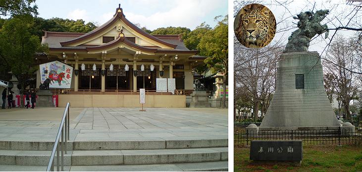 だいなんこう とくがわけいざん 大楠公 徳川 景山ひょう し かわ とど あに ぐうぜん みなとがわ いせき みず てん つら豹 は死して皮を留む豈偶然 ならんや。湊川の遺跡水 天に連なる。じんせいかぎり あ な つく な なんし せいちゅう ばんこ つと人生 限り有り名は尽くる無し。 楠氏の精忠 万古に伝う。詩文説明豹(動物)は死んでも人の為に皮を留めて貴重がられている。人は亡くなった後に名を残すといいますが偶然に残るものではない。それなりの功績があって後々までも名を残すのである。大楠公が戦死された遺跡の湊川に来てみると今も当時からの川の水は永遠とつながり流れている。楠木正成一族は、天皇を護るため国賊と戦い艱難辛苦の末、命を落とされたがその忠義の精神は人の心をうち、延々と今も絶え間なく人が訪れ続いている。これからも後世、万古に尽きることなく伝えられていくであろう。(人は一代名は末代)。 湊川神社です。2008年12月30日参拝してまいりました。 右は湊川公園の大楠公の勇姿像です。●「豹は死して皮を留む」で円内は豹。 湊川神社境内をめぐり、水戸黄門さん筆跡の「嗚呼忠臣楠子の墓」の文字と左が水戸黄門さんの像です。 正月前の準備におわれる湊川神社境内(2008・12・30) 中央・大楠公一代記掲示版絵図と説明 右・湊川の自刃の場面図多くの人達が全国から参拝に訪れています。これからも末長く大楠公の遺徳は輝き、連なり続けることでしょう。 上の絵は境内に掲示されていました掲示板の絵図の一部ですが、横に全部説明が書いてありましたが、説明を入れますと紙面が大幅に長くなりますので絵の部分だけを繋ぎ合わせてます)。作者 徳川景山江戸後期の水戸藩主徳川斉昭。字は子信。号は景山。おくり名は列公。15代将軍慶喜の父。藩校弘道館を設立。兵制改革に努力するも朱子学的な尊攘的行動が幕府に嫌われ謹慎を命ぜられる。のち、許されペリーの浦賀来航にあたり、幕政参与、継承問題で大老井伊直弼と対立幽居となり、そのまま61歳没した。人徳から西山公光圀に対し、小西山公と呼ばれた。