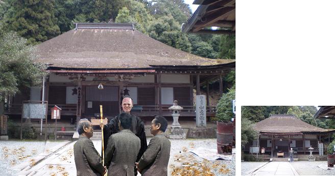 よしの かいこ ふじいちくがい 芳野懐古 藤井竹外 こりょう しょうはく てんぴょう ほ さんじ はる たず はる せきりょう 古陵の松柏 天ぴょうに 吼ゆ。山寺 春を尋 ぬれば春 寂寥。 び せつ ろう そう とき は や らっか ふか ところ なんちょう と 眉雪の老僧 時に 帚くことを 輟め。落花 深き 処 南朝 を 説く。 詩文説明吉野山の如意輪寺桜の花見に来たのだが、古い御陵のあたりに生えた松や柏の木は強い風に唸りを立てている。花はおおかた落ちて人影もなく、寂しい限りである。たまたま眉毛が雪のように白い老僧が辺りを掃いていたが、掃除の手をやめて落葉の多い中で昔の南朝の話をいろいろと説明をしてくれた。 藤井竹外は一人で如意輪寺を訪ね偶々掃除中の白眉の老僧が手を休め話してくれたのでしょうけど、詩文説明のため、遊び心が起こり、聞き手を3人に増やし落ち葉を作成。しかし実は藤井竹外に代わって聞いているのは私一人です。髪の毛も二人は黒くし、白眉の老僧も含めて1人4役を」演じた合成写真です。右の如意輪寺の境内の写真を元に左の写真を作成しております。 左は以前作った風に音を立てている松の木です。右は南朝の後醍醐天皇の御陵です (奈良県吉野山)。 左2枚の掛け軸は如意輪寺に展示してある藤井竹外の漢詩の掛け軸です少し光が入りました。 左から南朝の話の中の中心人物、後醍醐天皇・楠木正成・足利尊氏。