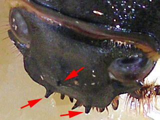 きょうエレファスのゼリーを交換してあげている時に、オスメス二人ともマットの上にいたので、じっくり観察しました。顔を近づけているとメスがいきなりパッと顔を上げ目が合いました(^-^;普段ほとんど注目されていないカブトのメスの顔。どアップで撮影してみました。赤い矢印のところ3か所に小さな角(というより突起)があるのに今日始めて気が付きました。役にたっているのかいないのか、もしかしたらこの突起を使ってマットの中をぐいぐい掘り進んでいるのかもしれません。この3つの突起ですが、オスの顔と比べてみます。なんだか丁度、額の角と長角の先の二つに分かれている部分にぴったりくる部分にメスの突起があるんですね。。。それにしてもメスの顔って、インパクトありすぎです‥。(目が前向いてるし‥)