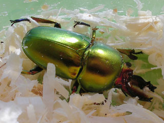 今年10月に入ってから、エレファスをいただき、12月にアウラタをいただき、一気に外国産カブクワの飼育に入りました。その中でエレファス、アウラタを下さった方、プレゼントを企画してくださった方など、たくさんの方にお世話になり、またこのブログを始めることでたくさんの方とお話し出来たことに感謝しています。今年最後の日記になりましたが、まだ撮影していなかったアウラタの画像を掲載します。先に書いてしまいますが、背景の白っぽい状態でのキンイロクワガタの撮影はダメでした。全く実物の綺麗さが画像になりません。今回は、羽化後の休眠期間ということに配慮してパインチップをそ~っと取り除いてストレスをかけないように撮影しましたので、これが限界でした。だいぶ画像補正で色の感じは出ましたが、またしばらくしてから撮影したいと思います。まずは、2匹いただいたアウラタキンイロクワガタのオスのうち、小さめのほうです。そして、大き目のオスです。全く兄弟らしいそっくりさんですが、実は大きさが倍近く違います。アウラタはパプキンより小さいとのことですが、同じアウラタの兄弟でもこれほど違うのかと思うほどなので、もし子供が生まれたら大きく育ててみたいなと思います。さてさて、より綺麗なメスですが、パインチップをめくっただけですぐに潜っていってしまいました。ここで気づいたのですが、キンイロクワガタの撮影は太陽光で行ったほうが良いということがいろんなサイトで言われていますが、まさにその通り。先日対面した時は夜で蛍光灯の下、小楯板が赤いの以外はグリーン一色と思っていたメスの羽にはブルーが混ざって見えました。大きさはメスが2cm弱、オスが2cm~3cmと非常に小さなクワガタですが本当に綺麗です。パプキンは飼育したことがないので、違いがわかりませんが、なんとかブリードしたいなと思います。2006年の目標でしょうか。。。2006年も皆さんにお世話になります。よろしくお願いします!!!