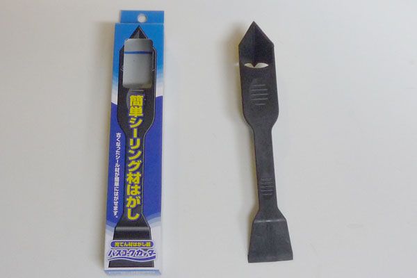 バスコークを打って、ヘラで一気に均します。コーキングの量が多すぎたので、ちょっと指でぬぐって量を減らしてから、もう一度ヘラで均しました。15分くらい待ってから、マスキングテープを剥がします。