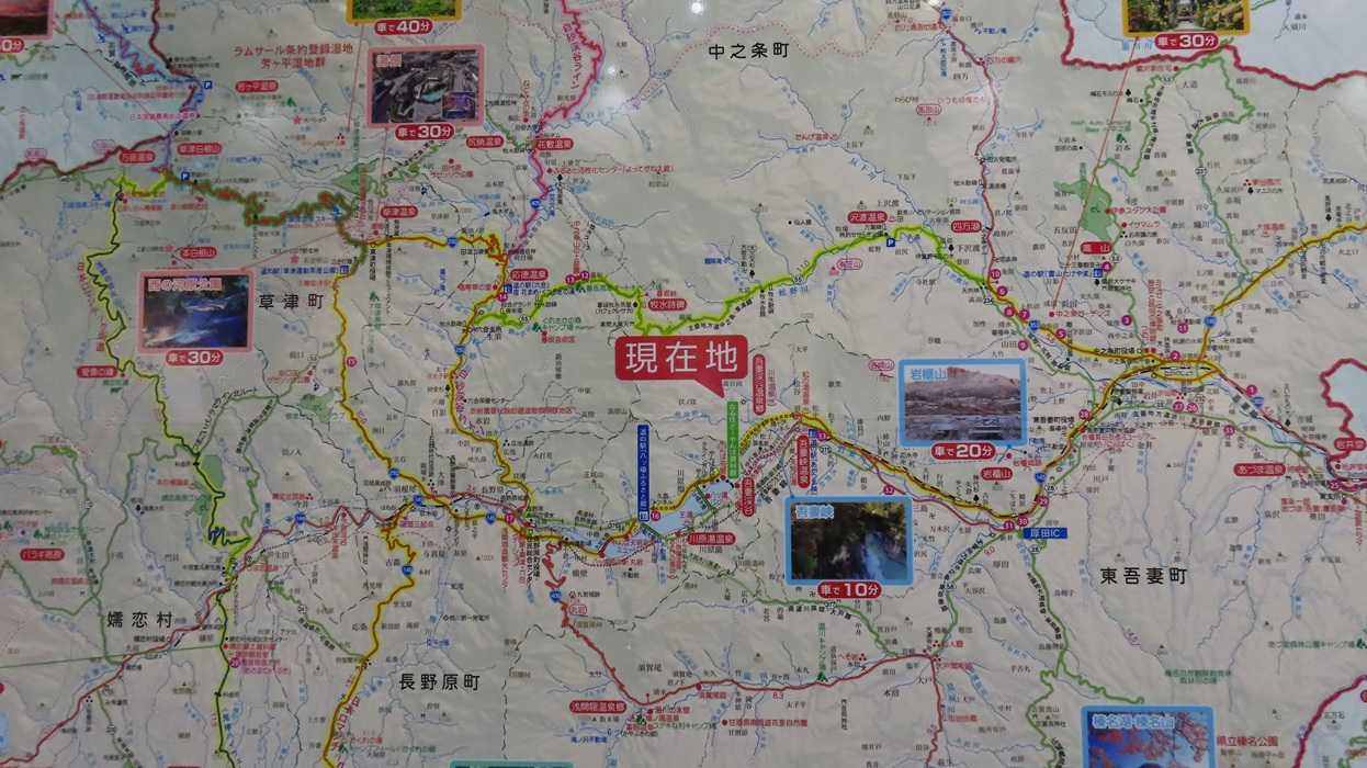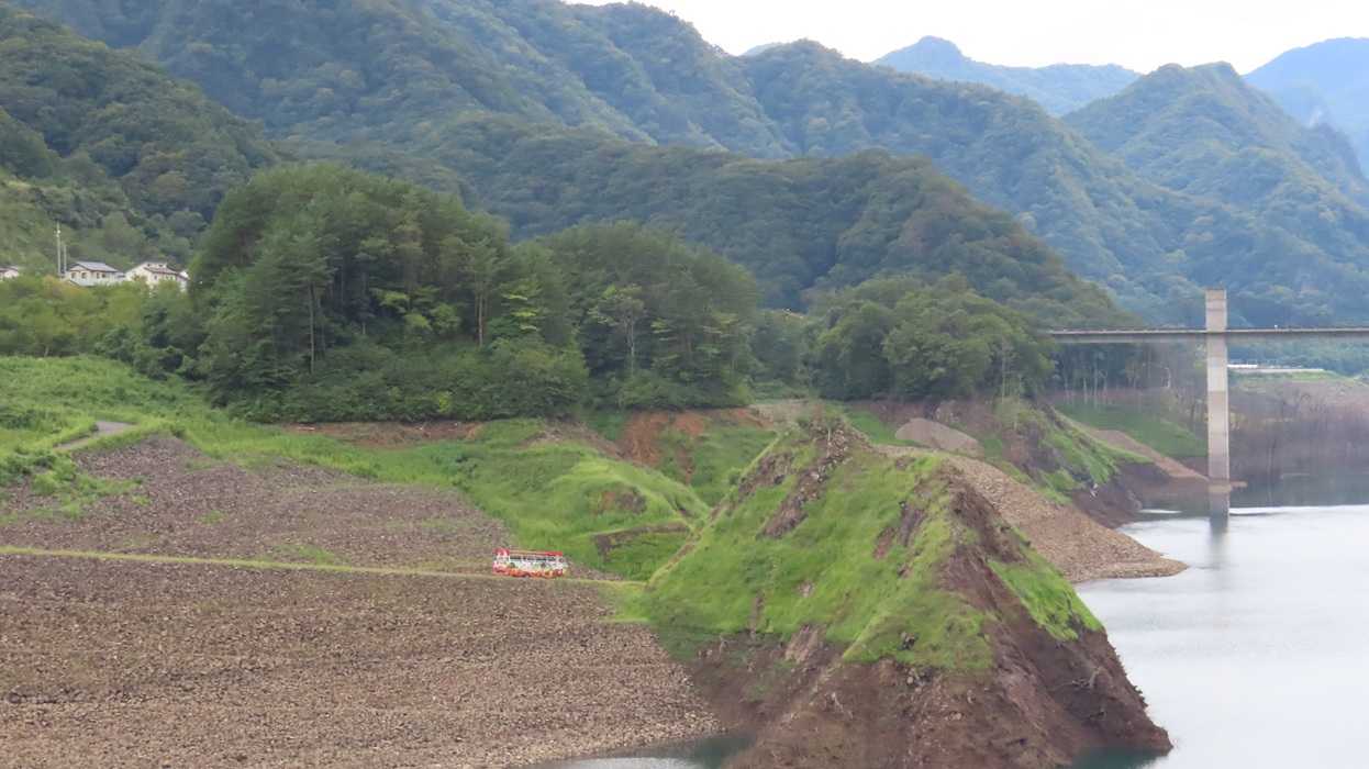 ここは地元の人に教えていただいた八ッ場ダムに沈んだトンネルや鉄道の線路などが貯水量の減少で目にすることができる場所です。ダムから車で5キロほどの八ッ場湖の駅丸岩です。奥の方が公園になっていました。ベンチに腰掛けダムを見ていた地元のおじさんがフレンドリーな方で色々説明してくれました~見えているトンネルの右側のが国道が走っていて左側が鉄道のトンネルだったそうです。(大雨で吾妻川の水量が増えると何度も不通になったとのことです。)中央あたりの石の積み上げてあるところが線路が走っていたんだそうです。台風19号の時は山の木との境の所まで水量がきたって!このおかげで下流は大丈夫だったんだとも言ってました~。この道は工事用だったそうです。水不足で遺構が見えるようになって来てらっしゃたかどうかはわかりませんがどのような思いで眺めていたのでしょうか?他にもいろいろ教えてくれました。貴重なお話をしてくれてありがとうございました。会話の中で「気温は高くないけどムシムシする」と話すと「草津に行ったら涼しいよ。30分くらいで行ける。ずっと登りだけどね。」とおじさんに勧められ行く事にしました~