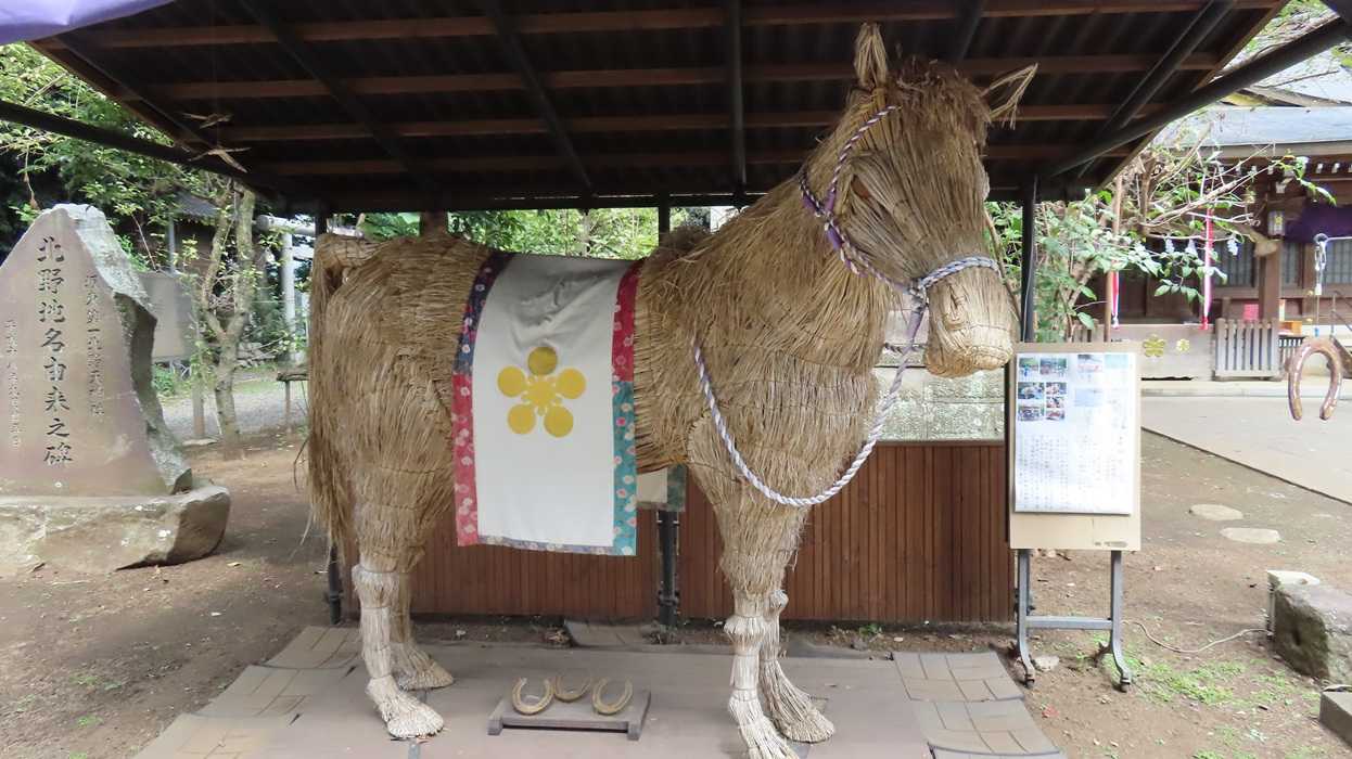 都道179号線(所沢青梅線)を走っている時に通りかかった神社に立ち寄り~(秩父からの帰りにのんびり一般道で自宅に帰る途中です。)一般道の楽しいところはこういう発見・出会いなどですね~。ここは所沢市小手指元町にある北野天神社です。入口すぐにあった藁で作られた馬に目が釘付けでした~(立派!よくできてる!)馬は古くから神様の乗り物とされていて神社に祈願する際には馬を奉納することがあったそうです。生きた馬の代わりに木彫りや板絵なども奉納され後にこれが「絵馬」と変遷したんだそうですね。この神馬は地元小手指産の木と稲わらで作られたもので氏子会の有志より奉納されたものだそうです。ベンチにトトロ~これはススキでつくったのかな?~縁台に居るのは小手指地域のゆるキャラ「こてまる」君。(初見~)航空神社も合祀されてます。交通安全・航空安全・業務安全の御利益もあるそうです。何かほっこりするような神社ですが深く知れば凄い歴史のある神社なのでしょう。