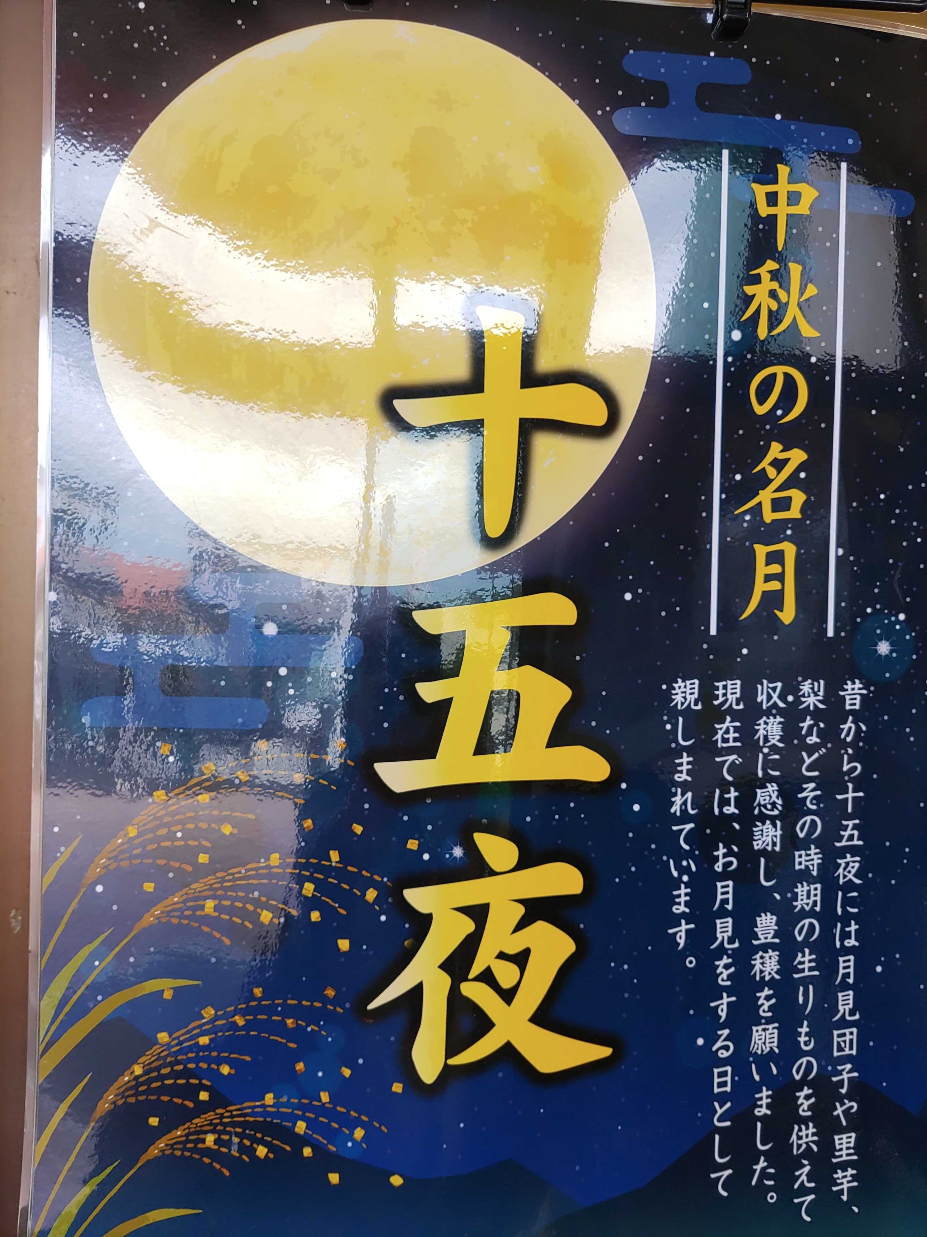 近所のスーパーにお買い物に行ったら入口は・・・このようになってました~今日は十五夜なんですね~旧暦では7月~9月を秋としてその真ん中(中秋)である8月15日頃の月が最も美しくみられるとされていました。平安貴族が中国から伝わった月の鑑賞の風習を取り入れたのが始まりで江戸時代になって庶民にも広まり現在の「お月見」の形に発展した歴史でした。子供のころ実家では四季折々・行事はきちんとやっていました。(もちろん十五夜も・・・)大人になってからは家庭を持った後も行事系はやっていなかった私です。子供のころのように月を見たり星を見たり空を見上げることも、遠くの山々や景色を見たりは日常生活においてはほぼなくなりましたね~。せめて十五夜の日は空を見上げてお月見しようと思うのですが 曇天で月はみえないです。