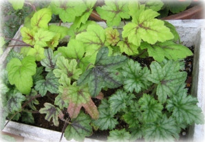 先日TVのガーデニング番組で紹介されてたヒューケラを植えてみました。 今までヒューケラのこと知らなかったんですが、すごくたくさんの種類があって、 寄せ植えするとカラフルな葉の色を楽しめます! ほんとはもっと明るい色と暗い色のコントラストに仕上げたかったのですが、 買いに行ったホームセンターには3~4種類しかなくて、よさそうなのをピックアップ。 (ヒューケラ全種類はこちら。色も豊富です!) 5月~6月ぐらいに花も付けますが、時すでに遅し…。 たぶんもう少し早く買いに行ってたら、花も咲いてたかも。来年に期待です! でもでもやっぱりメインは葉っぱ~ 斑入りの葉っぱとか大好き~ あとライムグリーンって涼 を感じません?夏場に見ると涼しげで良い感じ。 葉っぱの色を際立たせる&涼しく見せるため、白っぽいウッドコンテナに植えて正解! こちらもライムグリーンのシュガーバイン たぶん一昨年ぐらいに購入した株です。 日陰で結構ほったらかしですが つるが伸びて葉っぱがたくさんになりました! つるの先は新しい葉っぱなのでライムグリーンですが、株元のは濃いグリーン。 このコントラストも好きです!数珠繋ぎになる小さな葉っぱがカワイイ この花、何の花だと思います? 実はすっごく良い香りのローズマリーの花なんです! この株はもう何年も植わってる株で、母が一度株分けしてからすごく元気に! 今年は3月に咲いたばかりなのに、また花が咲いてます。 たしか去年も秋ぐらいに咲いてたような…。 一応花期は春みたいですが、なんでだろ でもこの花色もどことなく涼しげ~って暑いけど…