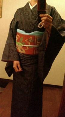 紺と黒の「大島紬」  茶色の「オームと椿の帯」