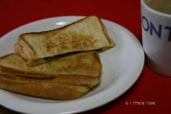 チーズと海苔って すっごく相性バッチリ(o^-')bって知ってます?20代の頃よく通った代々木上原のハシヤっていう和風パスタ屋さん(まだあるのかな?)で食べた海苔&チーズパスタが 今でも忘れられないほど美味しくて海苔とチーズって すっごくシンプルな組み合わせだけれど合うんだなぁって感激したものですウィーンに暮らしている時も習っていたクラシックギターの先生のお父様がトーストには海苔とチーズが1番っておっしゃっててそっか・・・・・パンにも合うんだぁ~ って それらのアイデアから自分で考案したのが海苔&チーズ パニーニフライパンにたっぷりバターを溶かし8枚切りのトーストパンを 両面に均等にバターが馴染むように焼いてスライスチーズと海苔を挟んで フライ返しで両面きつね色にいい色まで焼けたら出来上がり最近チビが 朝ゆっくり起きなので(夜が遅いのですが…) 朝カフェオレと このパニーニで ちょっとだけど 自分の時間楽しんでます寒くなってきても相変わらずの出しっぱなしおっぱいだけれど夜ミルクもなくなったし 寝てくれるようになったことは成長ですね追伸・・・・食べ物の物撮りって なんて難しんでしょう