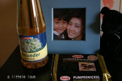 ウィーンに帰った長男から ママ宛に初めての小包が届いた この間の帰省中 東京に戻る前の日に届いてしまってて ほぼ夜中近くに帰宅すると 不在届けがポストに夜中であろうがお構いなしとばかり 不在届け握り締めて 勿論 即行取ってきました中に入ってた物この夏お兄ちゃんと過ごした日々の会話で 私がウィーンのあれが懐かしいなぁ これが食べたいなぁ って話してたものでしたウィーンにもうすぐ帰らなければという時に 『じゃあママの好きな物 ウィーンに帰ったら送ってあげるね』なんて言ってたけれど 本当に送って来てくれるとはその優しい気持ちが どれだけ嬉しかった事かひとつはHOLUNDER SIRUP(ホルンダーシロップ)って言う名前の甘いシロップ日本ではあまり馴染みがないようだけれど ホルンダーというニワトコの植物でハーブなどでも使用され 控え目な優しい香りが私は大好き現地の人 現地に長らく生活してる日本人は お花が咲く頃 自分で取ってきお花でシロップ作りをする人も多いです日本でもエルダーシロップって名前でd`arbo社から輸入しているのだけれど(エルダーは英語読みなのかな?オーストリアはホルンダーの名の方がポピュラー)ついこの間知ってびっくり!!なんとそのお値段にビックリしてしまっただってウィーンのスーパーじゃ(BILAとかSPARの自社ブランドだと)たしか5ユーロも出せばデッカイのが買えたはずなのに あまりにも高すぎで 日本じゃ手が出ないというか手を出す気もしないお値段この夏の猛暑でしんどい時に 『こんな暑い日は何が飲みたい?』ってな会話をしてた時にそういえば ウィーンに居た頃は 夏に沢山このホルンダーシロップやヒムベアーHimbeereシロップ(ラズベリーのシロップ)を冷たい炭酸水で割って飲んだよなぁ ママは日本ではこのシロップをカキ氷にかけて食べたいなぁなんて話をしてたんでそれで本当に送ってくれたんだと思いますカキ氷の季節はちょいと過ぎてしまったし まだ勿体無くて未開封炭酸水は買ってきたので チビの後追いがもう少しましになってほっとタイムの余裕が出来たら ちびちびと お酒なんかも入れてカクテルみたいにして飲んでみようかな~でもでも! ほんと!! カキ氷!!!まだやったことないけれど これ絶対美味しいはずですこのシロップがそんなに高くないなら 私が流行らせたいくらい現地に住んでる人も もしカキ氷作れる機械持ってる人いたら 是非やってみてほしいなぁもうひとつはPumpernickel(プンパーニッケル)っていうライ麦100%の黒パン初めて食べた時は『にゃんだぁこりゃァァ??』って発酵しすぎの酸っぱいお味噌みたいな変な味でおまけに食べ応え、喉越しの何て悪い食べ物なの?ってかなり印象悪かったのに何ででしょうね・・・段々滞在年数長くなると好きになっていくの日本に来たお相撲さんが 最初納豆とか食べられないのがだんだん食べられて好きになるような感じと同じなんでしょうねこれも何か懐かしいなぁ たまには食べてみたいなって言ってたの覚えててくれたみたい久しぶり懐かしい味を堪能出来て嬉しかった驚いたのがチビがこんな玄人好みのパンを もっとくれ! もっとくれ!って喜んで食べた。体に凄くいいパンでお腹にもいいから有難いけどねそれと1通のお手紙も残念ながらお兄ちゃんが書いたものではなくて from Spainお兄ちゃんが4歳くらいから低学年の頃まで 週一回通っていた日本語を話す会で当時お世話になったO先生からウィーンの後スペインに行かれて 長らくバルセロナにいらっしゃたようだけれど今回帰国されると連絡を下さった彼女には 元私たち夫婦が離婚して 私もEX旦那も新しい生活をスタートさせたことを知らせてないまま 今までに何通かお手紙を頂いてて そのたび心苦しいながらも申し訳ない気持ちでお返事できてないままだったので これを期に 連絡してみるつもり色んな思い出 懐かしい気分を届けてくれたお兄ちゃんに感謝!ちなみにパケッド代金が30ユーロもかかってしまったとか。。。悪かったねぇ 申し訳ないねぇ今度は船便でいいからねっ